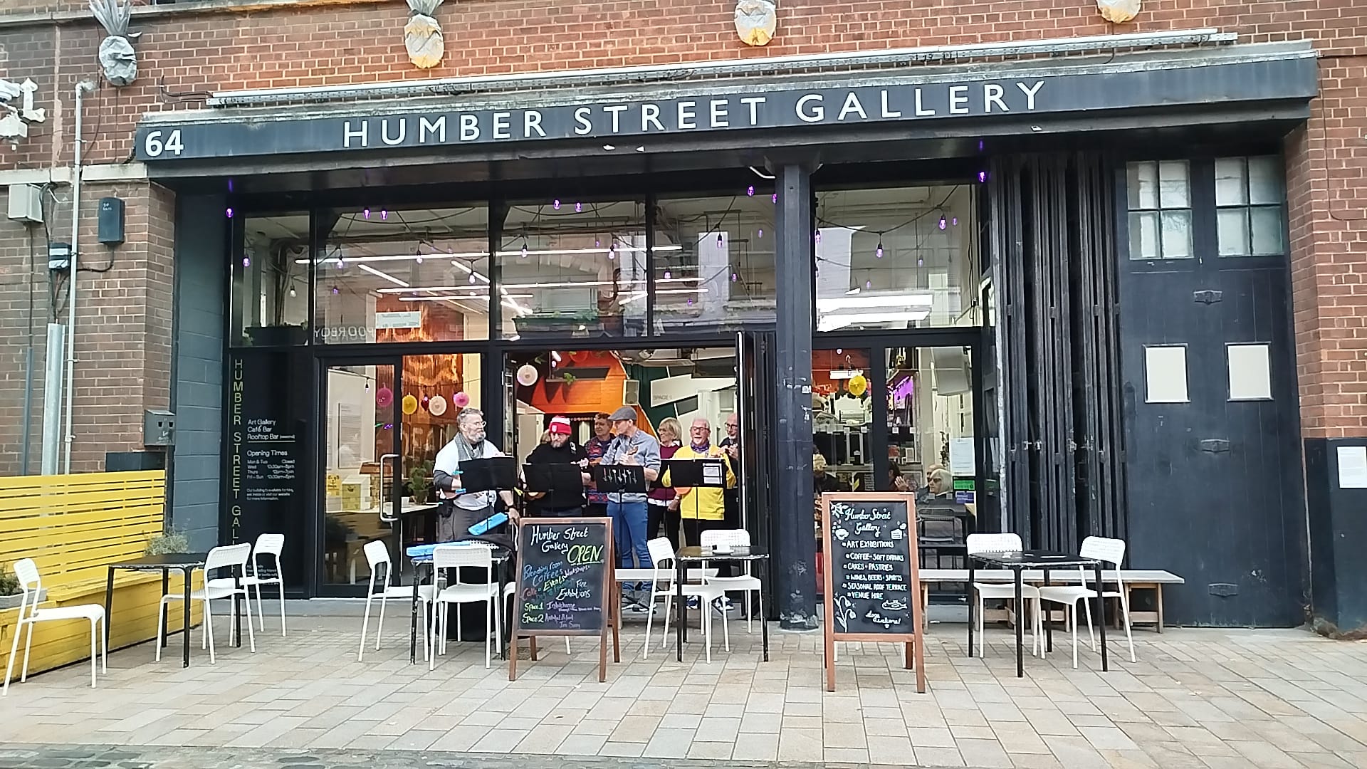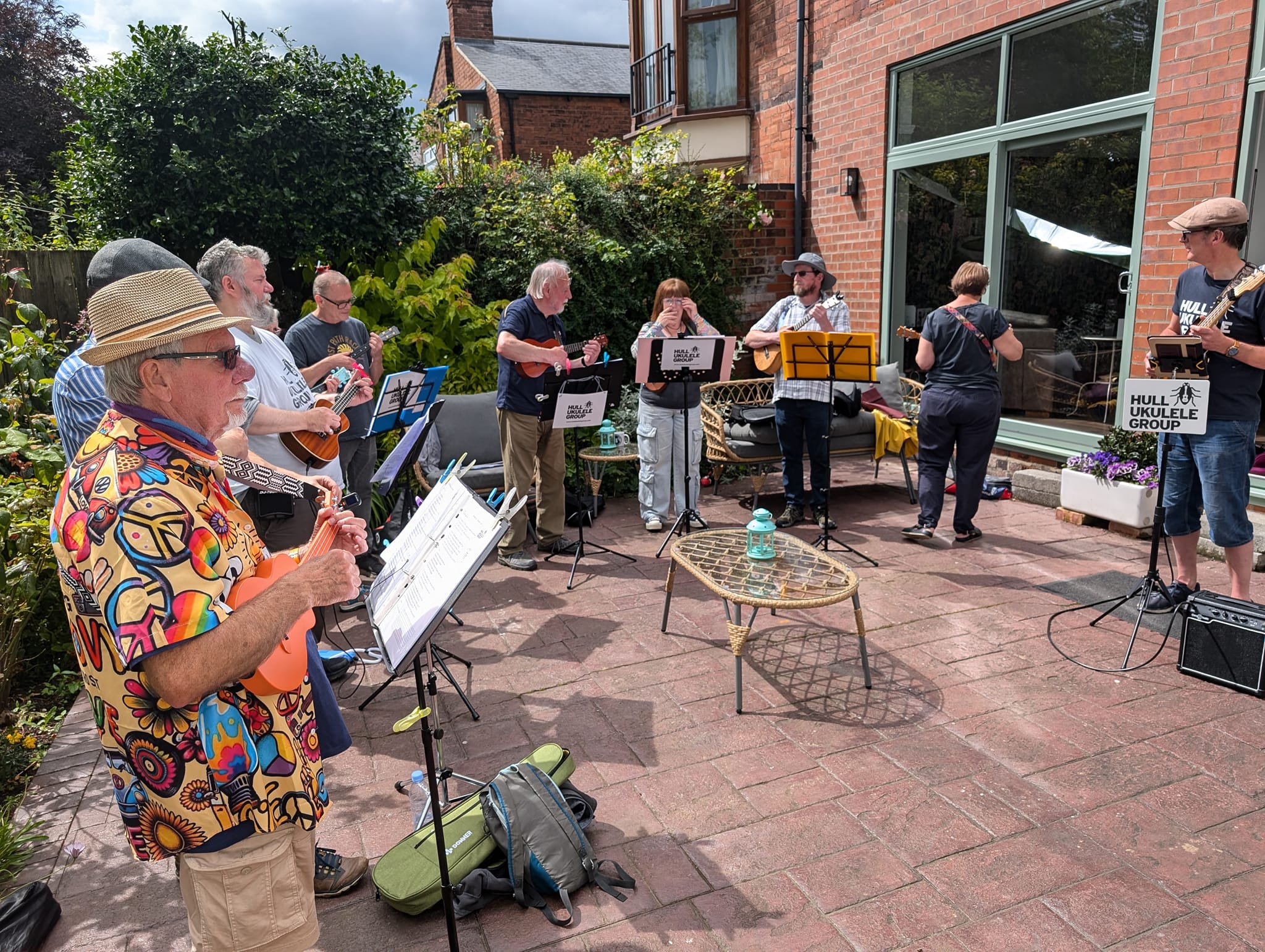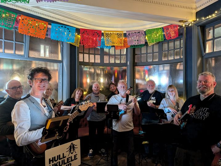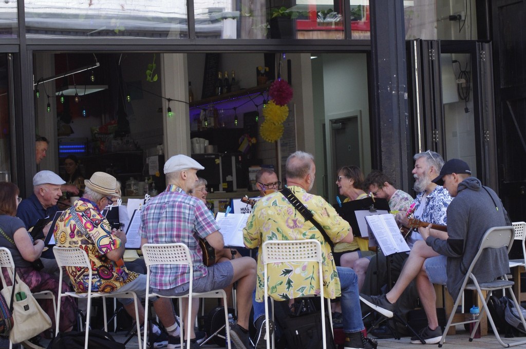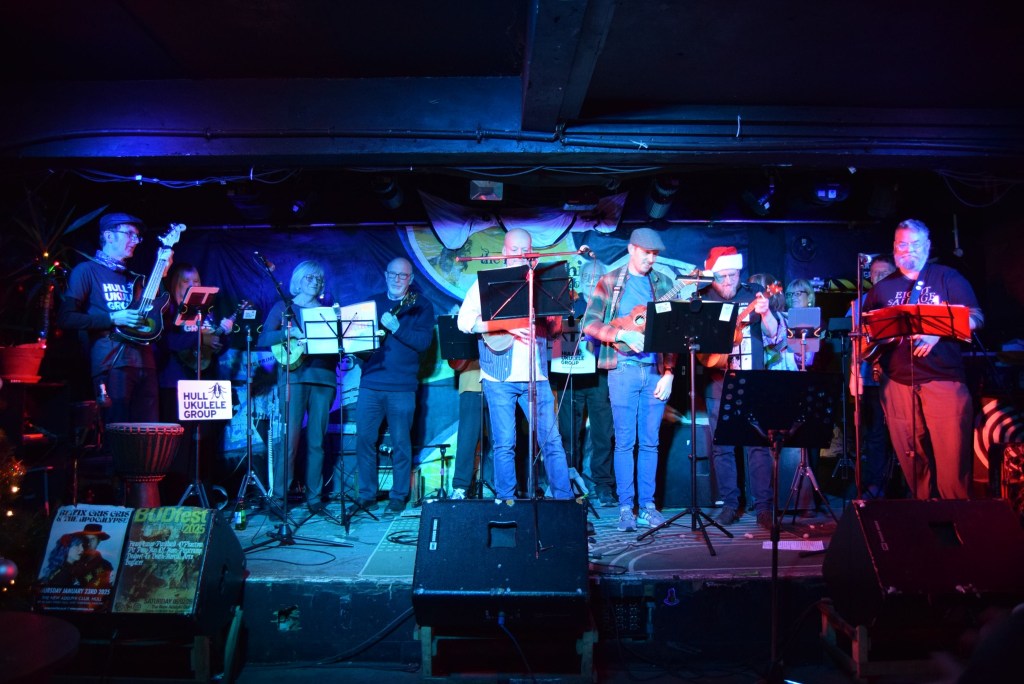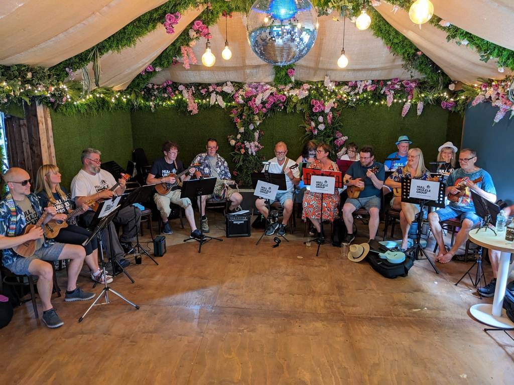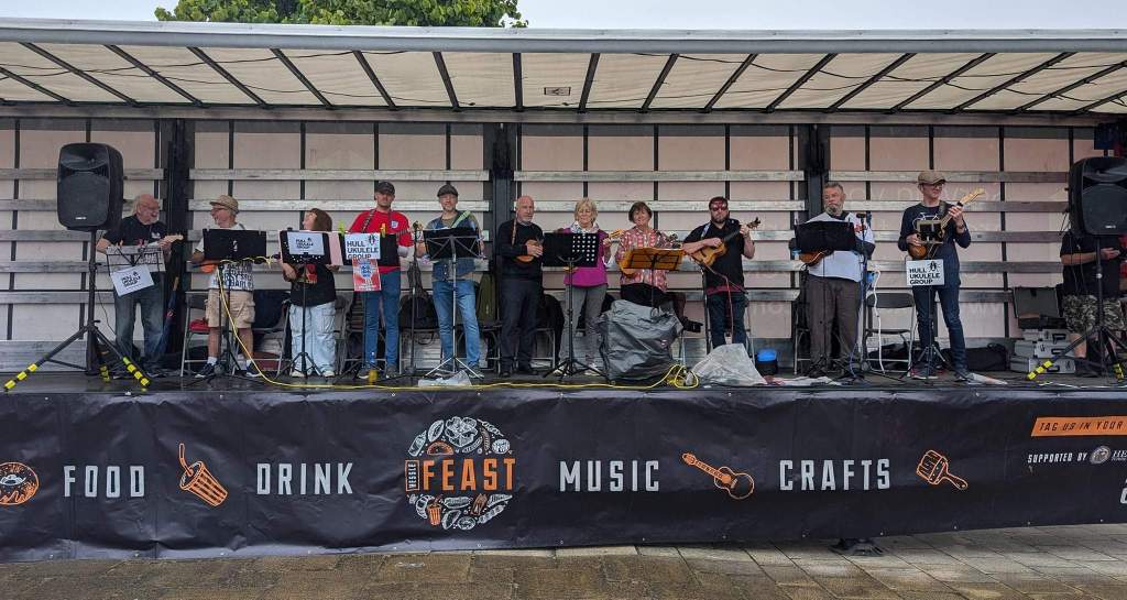 In keeping with the tradition of organisers getting the name wrong, at Ella Street Festival, we were advertised in advance, on chalk board timetables and over the speaker system on the day as “Hug Ukulele Group”. Me saying “Hull Ukulele Group – spells H.U.G.” seems to have been misinterpreted.